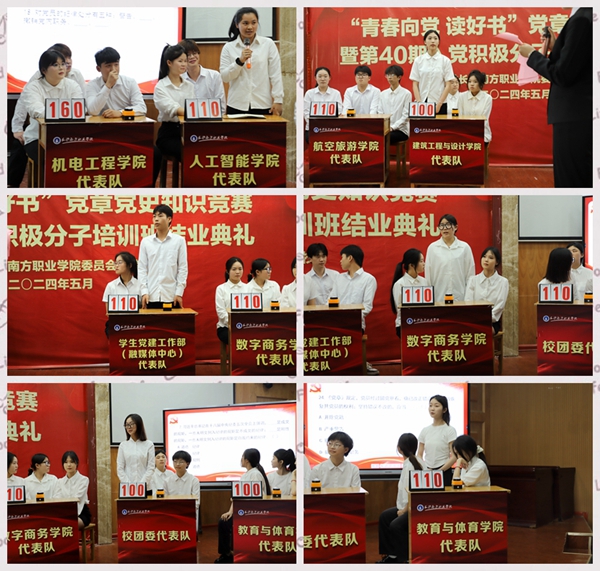 本次竞赛经各党总支初赛,评选出来自各学院、校团委及学生党建工作部(融媒体中心)8支参赛队。采用必答题、抢答题、风险题方式经三轮比拼,机电工程学院获一等奖,航空旅游学院、人工智能学院、数字商务学院、学生党建工作部(融媒体中心)获二等奖,教育与体育学院、建筑工程与设计学院、校团委获三等奖。现场,对知识竞赛获奖代表队及党训班优秀学员、优秀组长进行了集体表彰。
