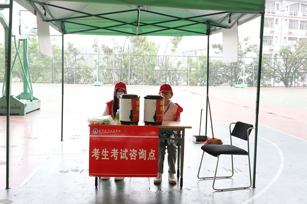 此外,我校在篮球场还贴心地为陪伴考生的家长们设立了等候休息区,现场还有志愿者们为大家提供免费的热饮和茶水。