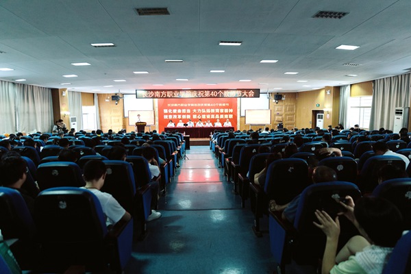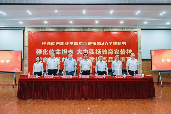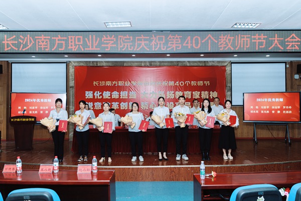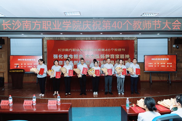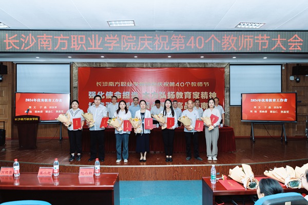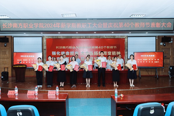 9月10日下午,长沙南方职业学院庆祝第40个教师节表彰大会在本部校区学术报告厅召开。大会以“强化使命担当 大力弘扬教育家精神;锐意改革创新 精心建设高品质南职”为主题。政府督导、校党委书记赵小群,中公教育集团副总裁秦小航,校长肖晓春,副校长王金、吴涛、肖建伟、王建辉出席,全体中层领导干部及教职工代表共400余人参加,大会由赵小群主持。