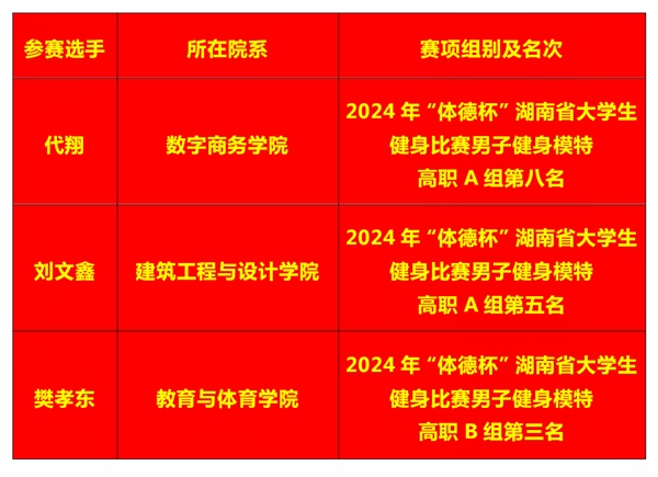 据赛事组消息,在刚刚闭幕的2024年湖南省大学生健身比赛传来喜讯:我校代翔、刘文鑫、樊孝东三位学生晋级决赛并取得优异成绩。