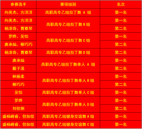 长沙南方职业学院党政各级领导,高度重视学院办学品牌特色,狠抓人才培养质量,教育与体育学院、体育艺术表演专业负责人和团队成员凝心聚力、积极响应,精心选拔并组建了24人的优秀学生队伍参赛。经过长时间的积极备赛和刻苦训练,在赛场上展示出了本专业、扎实的功底与专业技能,获得了在场评委的高度认可。斩获双人、单人、团体金牌13块;双人、单人银牌9块;双人铜牌2块。