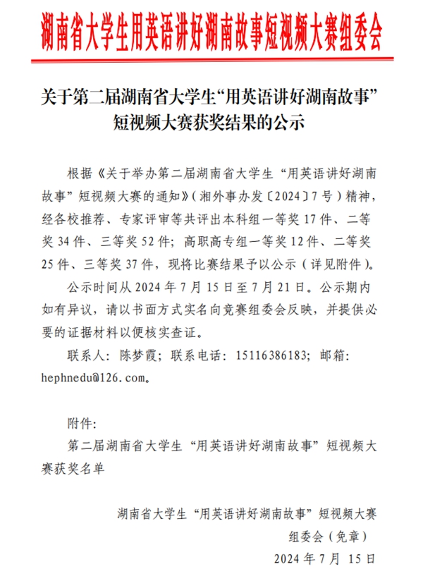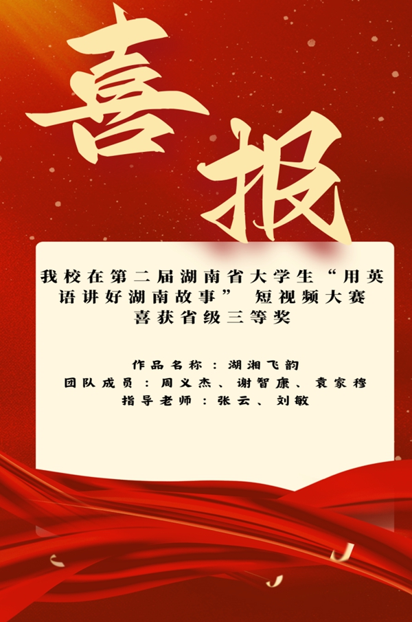 7月15日,第二届湖南省大学生“用英语讲好湖南故事”短视频大赛获奖结果公布,长沙南方职业学院推荐作品《湖湘飞韵》获三等奖。