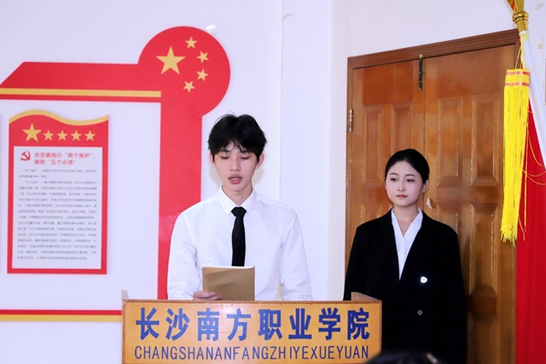 航空旅游学院学生党支部入党积极分子杨浩、王子涵分享参加第十一届全球湘商大会志愿服务工作感想。他们讲述了在志愿服务实践过程中的心得体会,以及如何将党校学习的理论和日常所学专业知识同志愿服务实践相结合的成长收获,展现了新时期南职青年大学生的先锋模范作用与担当作为,坚定了南职青年大学生服务社会、奉献青春的信念。