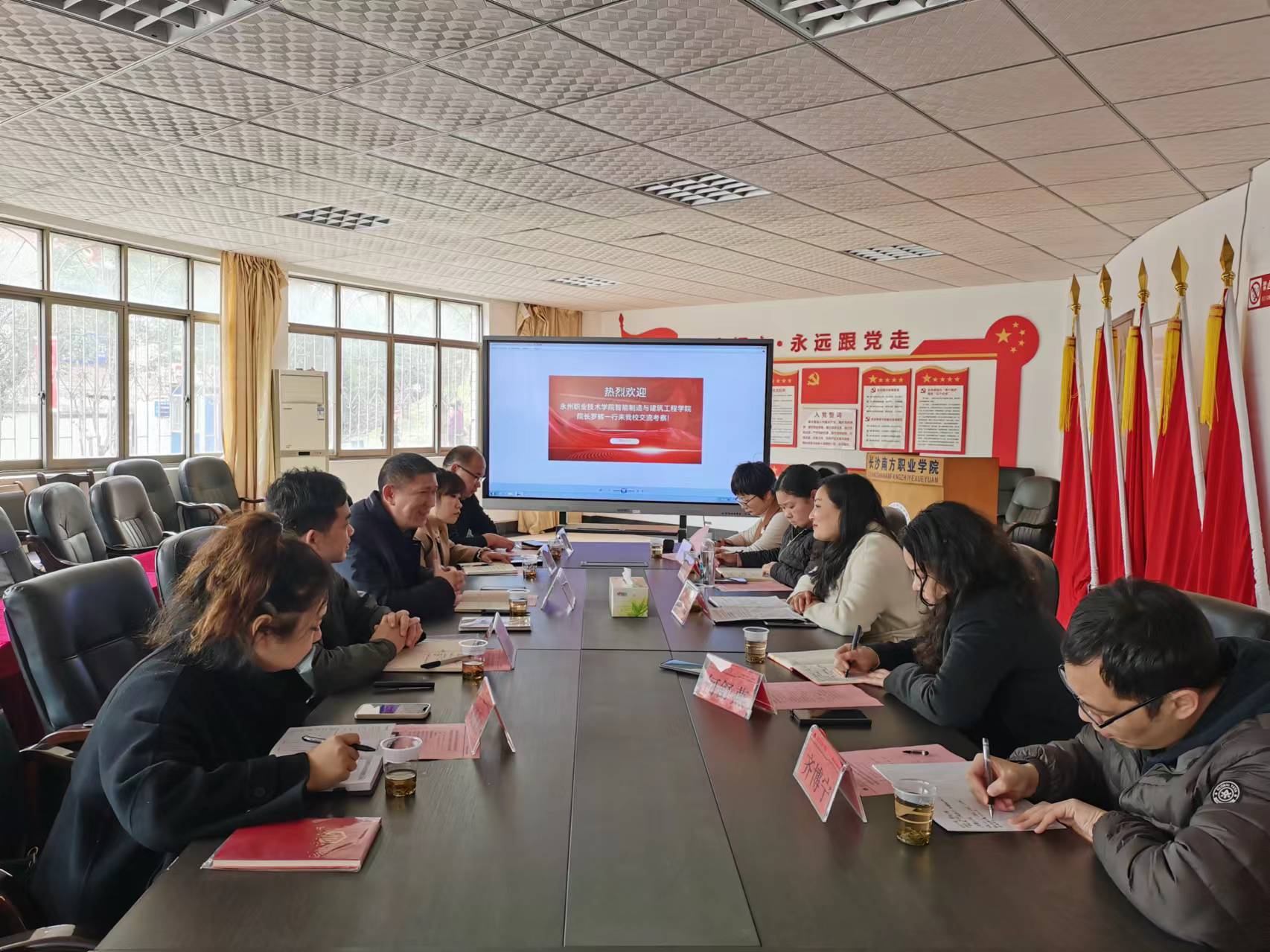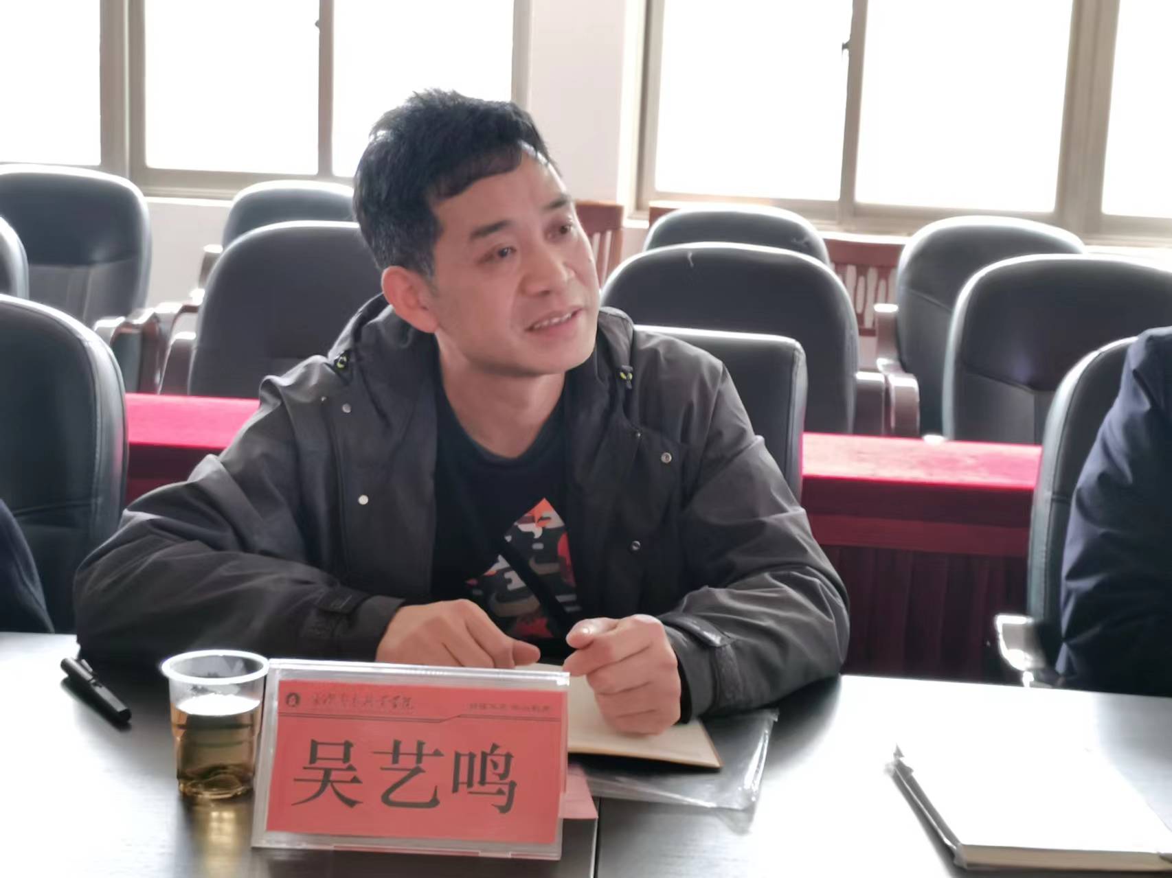 调研交流座谈会在校本部8-219会议室举行,曾文妮主持会议。会上,双方介绍学校、学院基本情况后,就建筑室内设计专业核心课程开设、人才培养方案、技能抽查题库、毕业设计指导、学生管理和校企合作等方面展开深入研讨。