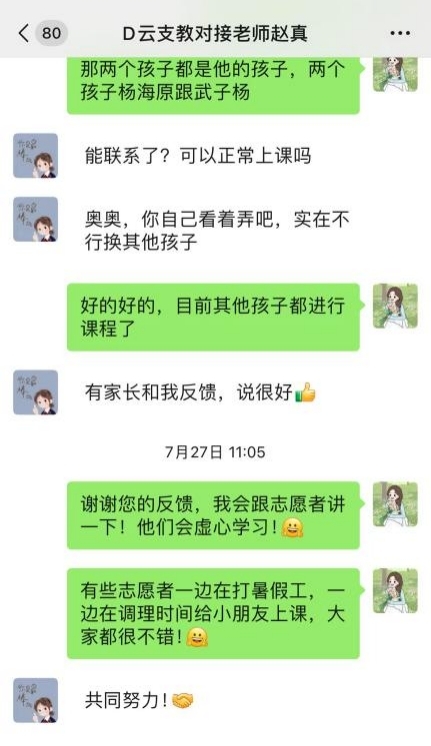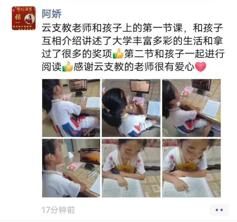 “云支教”活动真的是太好了!自从孩子报名参加“云支教”活动,我明显感受到了她的变化。志愿者们不仅指导孩子更好地完成暑期作业,还陪伴孩子“共读一本书”“一起云运动”等,帮助孩子养成良好的学习、生活习惯,孩子变得更加积极主动、自信阳光,我真的特别高兴,非常感谢南职提供的“云支教”平台,感谢志愿者们!