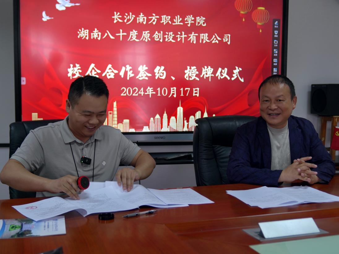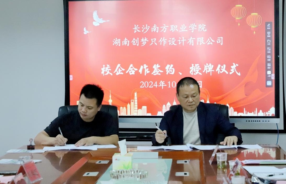 10月17日上午,长沙南方职业学院(下称学校)与湖南八十度原创设计有限公司(下称八十度公司)、湖南创梦只作设计有限公司(下称创梦公司)校企合作签约仪式在学校校本部8栋419会议室举行。学校副校长肖建伟、教务处处长龙跃君、继续教育部主任王斌、招生就业处副处长谭泽良、建筑工程与设计学院(下称建筑学院)相关人员及企业人员参会。会议由项林主持。        肖建伟代表学校向八十度公司、创梦公司的领导、嘉宾表示感谢。他指出,校企合作共建中国特色学徒制订单班,是贯彻落实《中华人民共和国职业教育法》关于推行“中国特色学徒制”的具体实践,为推进中国式现代化提供有力人才支撑,也为学生的实习、就业提供更多机会,是校企双方贯彻落实立德树人根本任务的重要举措。希望双方在就业推荐、产学合作,科技创新等方面进一步加强合作,共同建设更加完善的“产、学、研、创”基地。        八十度公司总经理郑学超致辞。他表示,企业的核心竞争力在于人才,通过校企合作,学校为企业输送高素质、高技能的应用型人才,企业为学生提供大量的实习实训、就业机会,进而实现企业、学校、学生乃至社会共赢。希望后续能与学校深度合作,共同探索人才培养新思路新模式,培养更多高素质技术技能人才!        创梦公司总经理周财宝致辞。他表示,创梦公司自成立以来,始终坚持以“创新”为核心发展,目前是行业的领军企业之一。希望后续与学校在人才培养、研发合作等方面持续合作,共同培养具有创新能力、实践能力的高素质技术技能人才,为推进技能型社会不断贡献力量!        会上,学校分别与八十度公司、创梦公司进行校企合作签约、授牌仪式。        会议结束后,校企双方共同参观材料构造与工艺展示实训室、建筑工程教学实训中心、建筑施工特种作业人员培训基地等实训室。        本次会议的成功召开,进一步深化了校企合作、产教融合,推进教育链、人才链与产业链、创新链有效衔接,推进建筑学院“一院一品”工程建设,深化了学校“建筑专业群+学徒制”的产教融合模式,为培养更多高素质技术技能人才奠定坚实基础。