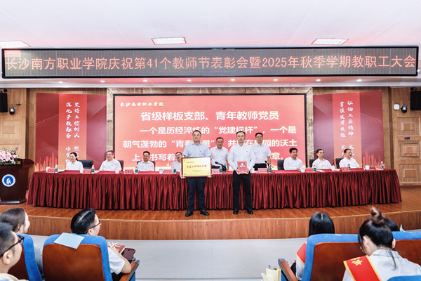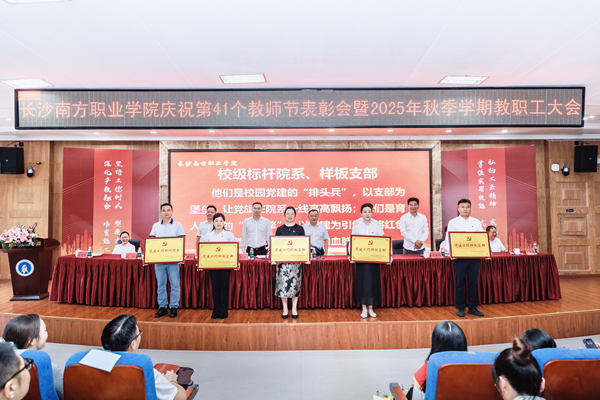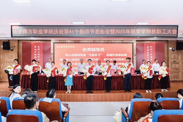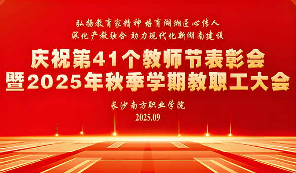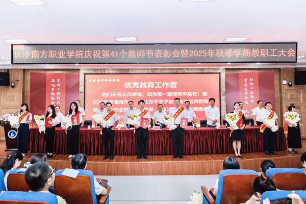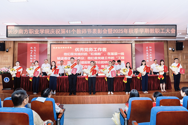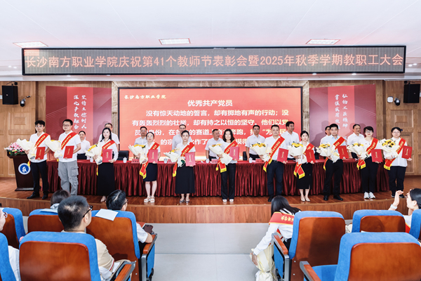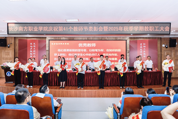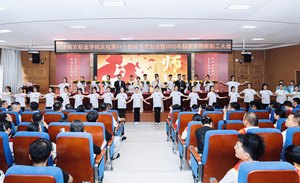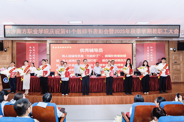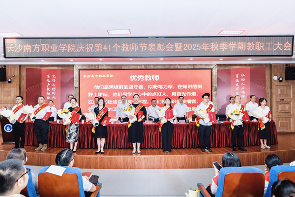 9月9日下午,长沙南方职业学院庆祝第41个教师节表彰大会暨2025年秋季学期教职工大会在校本部学术报告厅举行。大会以“弘扬教育家精神,培育湖湘匠心传人;深化产教融合,助力现代化新湖南建设”为主题。