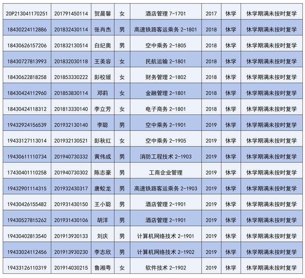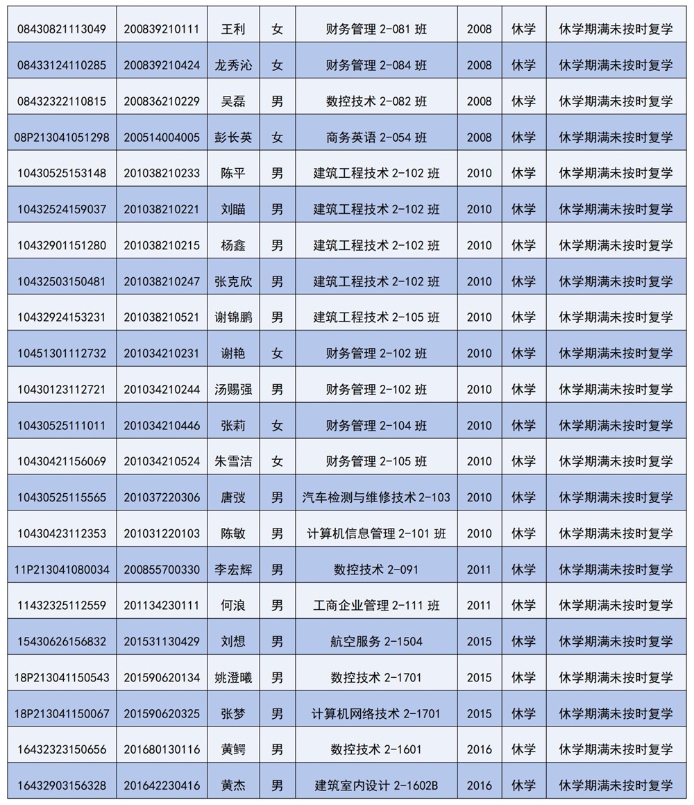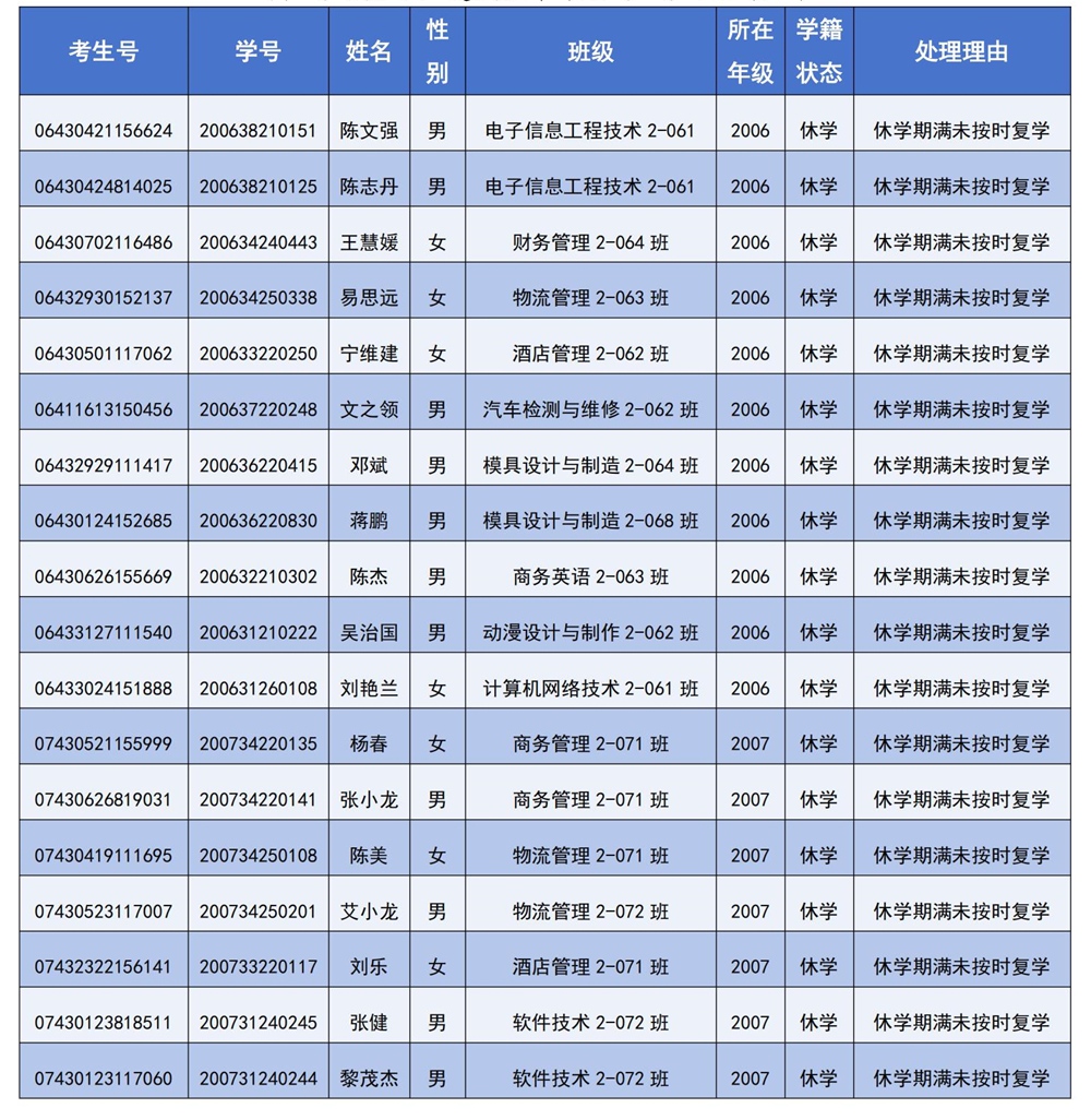 经审查,发现陈文强等 57 名学生(具体名单见附件)休学期满后,未在规定时间内向学校提交复学材料,且根据其学业进度及剩余时间评估,无法在学校规定的修业年限内完成学业。现依据《长沙南方职业学院学生管理规定》第三十二条、第三十六条之规定。经学校研究,决定对陈文强等 57 名休学期满逾期未复学学生作出退学处理。
