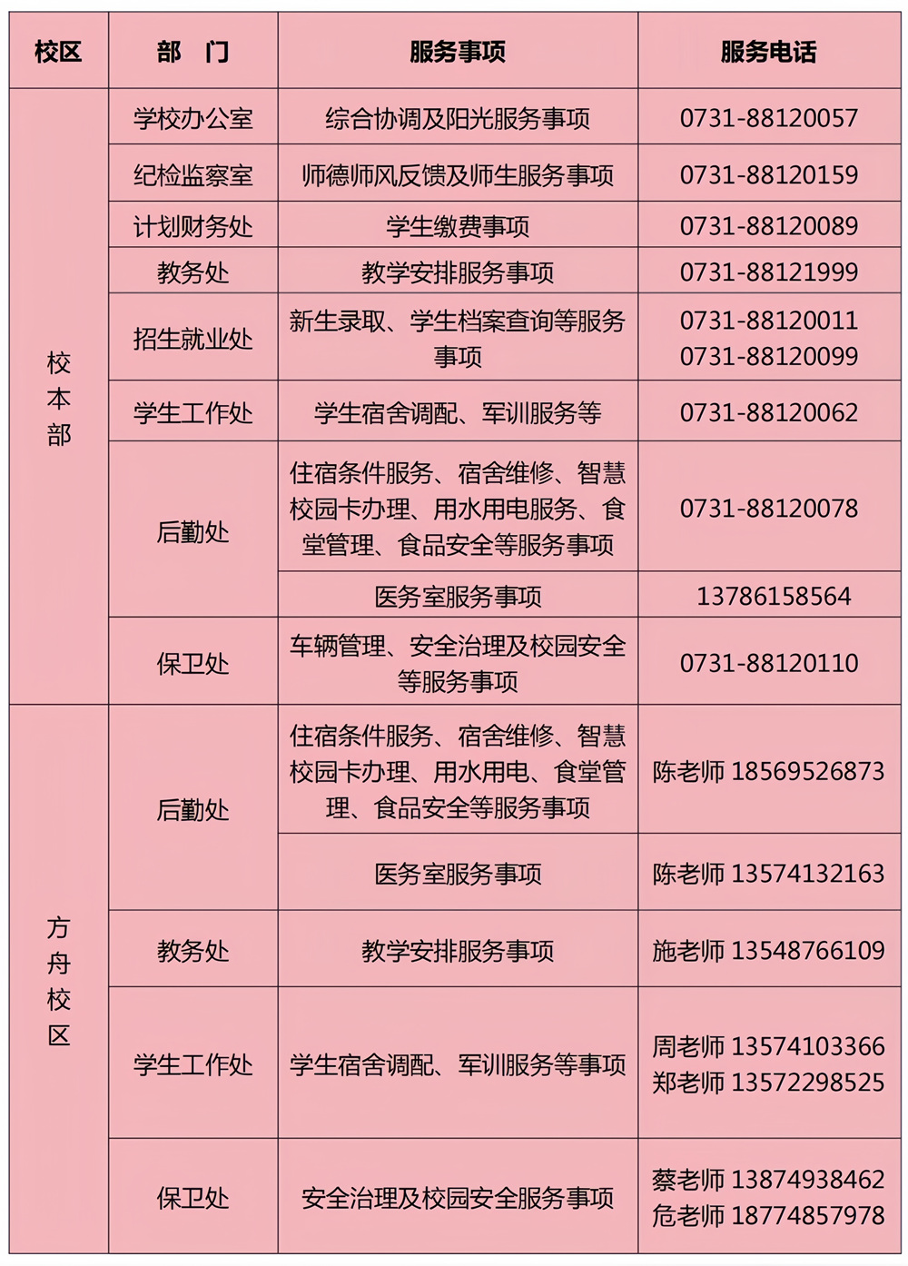 方舟校区服务热线:陈老师 18670209186,接待地址:方舟校区学培楼一楼101室阳光服务中心。