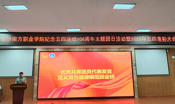 长沙市见义勇为道德模范田金锌同学作优秀共青团员代表发言,他分享了见义勇为的初心与感悟,号召同学们以实际行动诠释青春担当。“奋斗是青春最亮丽的底色!” 现场青年纷纷表示,将以受表彰的集体和个人为榜样,在新征程中挺膺担当,让青春在强国建设中绽放光芒。