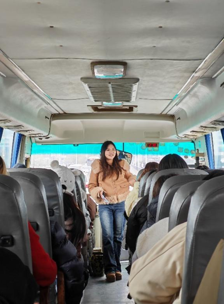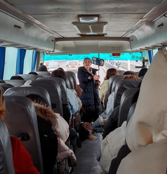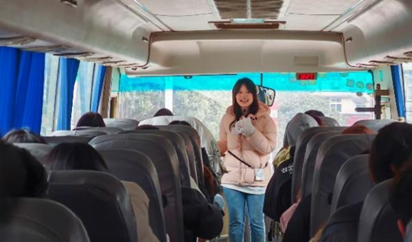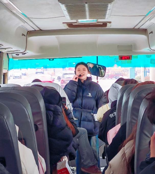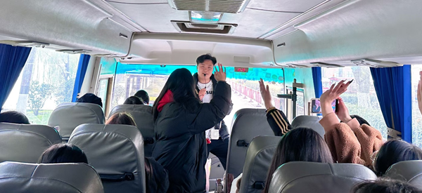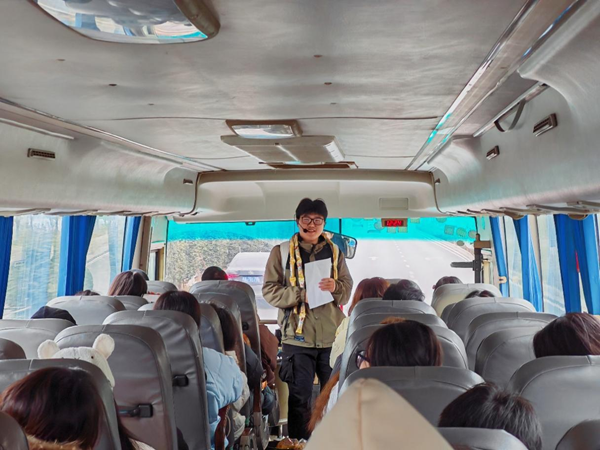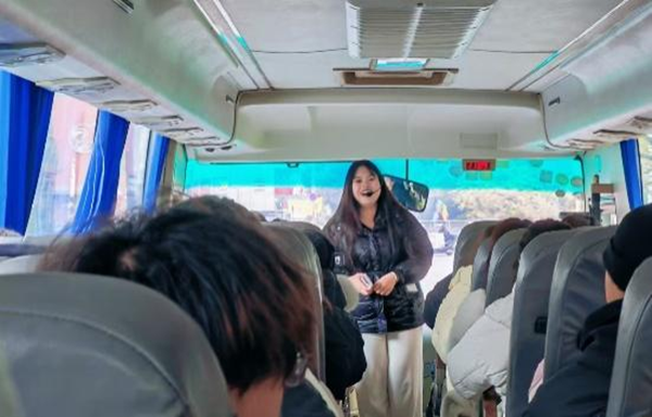 当南方职院校车的引擎轰鸣声响起,一场别开生面的导游技能实训正式拉开帷幕。上车伊始,“地陪导游”就迅速进入角色,迎接“游客”,点名签到,以最饱满的热情致欢迎词。亲切的问候、自信的笑容,瞬间拉近了与“游客”的距离。“地陪导游”各展其能,从讲述沿途风景到分享当地趣闻,从展示个人才艺到组织互动游戏,“游客”听得认真,笑得开心,一下就把车内气氛点燃。窗外是城市的流动风景,车内是热烈的交流互动,此刻旅游大巴华丽变身,成了独特的实训课堂。