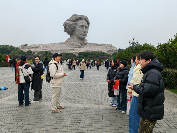 晨曦初照,橘子洲映入眼帘,青年毛泽东雕塑雄浑壮观。同学们下车迅速分组进入各自角色,模拟带团开场,充满自豪地向“游客”介绍橘子洲文化,从景区大门到雕像沿途,将毛主席求学、革命足迹娓娓道来,以激昂语调重现那段热血岁月。面对“游客”好奇追问,导游们灵活应答,巧妙穿插诗词典故,兴之所至,即兴背诵起了《沁园春.长沙》,把橘子洲的人文魅力展现得淋漓尽致,引来了不少真正的游客驻足聆听,鼓掌点赞。