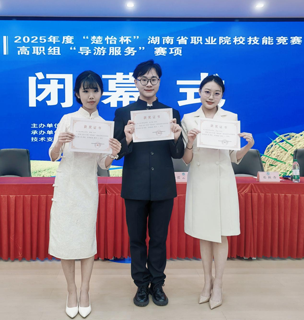 近日,2025年度“楚怡杯”湖南省职业院校技能竞赛高职组“导游服务”赛项在怀化职院圆满落幕。经过激烈角逐,航空旅游学院三名学生(旅游管理专业2-2303班罗瑶、鲜瑞和高速铁路客运服务专业2-2303班吴宁波)凭借扎实的专业功底、出色的临场表现和良好的职业素养,均荣获三等奖。